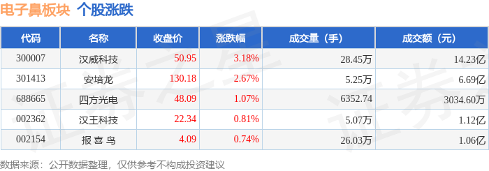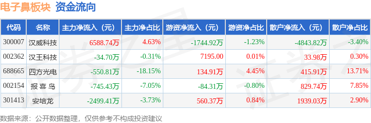 从资金流向上来看,当日电子鼻板块主力资金净流入2758.38万元,游资资金净流出1133.23万元,散户资金净流出1625.16万元。电子鼻板块个股资金流向见下表: