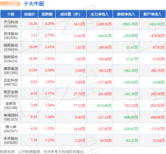 个股表现方面,饲料行业当日领涨股为天马科技(603668),该股当日报收16.29,上涨4.29%,成交量34.13万,主力资金净流入5328.3万元。百洋股份(002696)以上涨2.75%紧随其后,该股当日成交量13.62万,主力资金净流出184.82万元。除此之外,路斯股份(920419)、路斯股份(920419)、播恩集团(001366)均进入当日牛股之列。具体个股列表见下表: