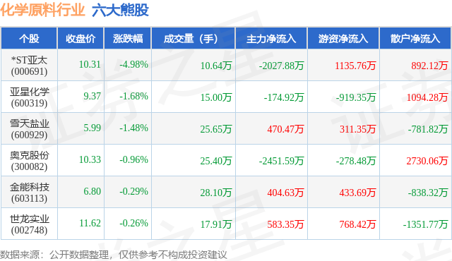 个股表现方面,化学原料行业当日领跌股为*ST亚太(000691),该股当日报收10.31,下跌4.98%,成交量10.64万,主力资金净流出2027.88万元。亚星化学(600319)以下跌1.68%紧随其后,该股当日成交量15.0万,主力资金净流出174.92万元。除此之外,雪天盐业(600929)、奥克股份(300082)、金能科技(603113)均进入当日熊股之列。具体个股列表见下表: