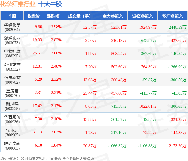 个股表现方面,化学纤维行业当日领涨股为华峰化学(002064),该股当日报收9.66,上涨3.98%,成交量32.57万,主力资金净流入523.61万元。彩蝶实业(603073)以上涨2.82%紧随其后,该股当日成交量2.3万,主力资金净流入216.19万元。除此之外,中复神鹰(688295)、苏州龙杰(603332)、恒申新材(000782)均进入当日牛股之列。具体个股列表见下表: