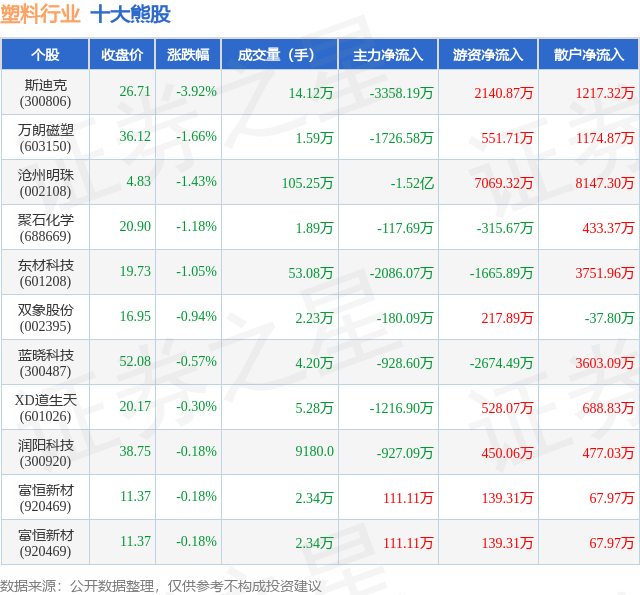 个股表现方面,塑料行业当日领跌股为斯迪克(300806),该股当日报收26.71,下跌3.92%,成交量14.12万,主力资金净流出3358.19万元。万朗磁塑(603150)以下跌1.66%紧随其后,该股当日成交量1.59万,主力资金净流出1726.58万元。除此之外,沧州明珠(002108)、聚石化学(688669)、东材科技(601208)均进入当日熊股之列。具体个股列表见下表: