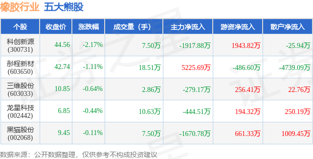 个股表现方面,橡胶行业当日领跌股为科创新源(300731),该股当日报收44.56,下跌2.17%,成交量7.5万,主力资金净流出1917.88万元。彤程新材(603650)以下跌1.11%紧随其后,该股当日成交量18.51万,主力资金净流入5225.69万元。除此之外,三维股份(603033)、龙星科技(002442)、黑猫股份(002068)均进入当日熊股之列。具体个股列表见下表: