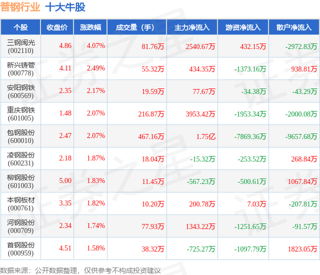 个股表现方面,普钢行业当日领涨股为三钢闽光(002110),该股当日报收4.86,上涨4.07%,成交量81.76万,主力资金净流入2540.67万元。新兴铸管(000778)以上涨2.49%紧随其后,该股当日成交量55.32万,主力资金净流入434.35万元。除此之外,安阳钢铁(600569)、重庆钢铁(601005)、包钢股份(600010)均进入当日牛股之列。具体个股列表见下表: