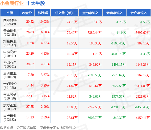 个股表现方面,小金属行业当日领涨股为西部材料(002149),该股当日报收20.52,上涨10.03%,成交量74.79万,主力资金净流入3.33亿元。云南锗业(002428)以上涨6.6%紧随其后,该股当日成交量72.4万,主力资金净流入5382.44万元。除此之外,翔鹭钨业(002842)、中钨高新(000657)、华锡有色(600301)均进入当日牛股之列。具体个股列表见下表: