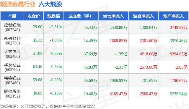 个股表现方面,能源金属行业当日领跌股为盛新锂能(002240),该股当日报收29.6,下跌2.31%,成交量45.43万,主力资金净流出2540.86万元。永兴材料(002756)以下跌1.03%紧随其后,该股当日成交量14.49万,主力资金净流入1668.85万元。除此之外,天齐锂业(002466)、华友钴业(603799)、赣锋锂业(002460)均进入当日熊股之列。具体个股列表见下表: