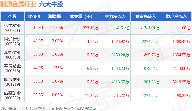 个股表现方面,能源金属行业当日领涨股为盛屯矿业(600711),该股当日报收13.93,上涨7.73%,成交量323.49万,主力资金净流出1.51亿元。博迁新材(605376)以上涨3.05%紧随其后,该股当日成交量4.64万,主力资金净流入1073.92万元。除此之外,藏格矿业(000408)、寒锐钴业(300618)、腾远钴业(301219)均进入当日牛股之列。具体个股列表见下表: