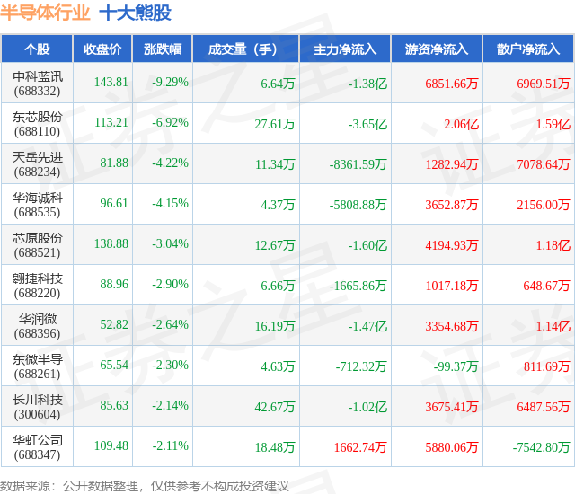 个股表现方面,半导体行业当日领跌股为中科蓝讯(688332),该股当日报收143.81,下跌9.29%,成交量6.64万,主力资金净流出1.38亿元。东芯股份(688110)以下跌6.92%紧随其后,该股当日成交量27.61万,主力资金净流出3.65亿元。除此之外,天岳先进(688234)、华海诚科(688535)、芯原股份(688521)均进入当日熊股之列。具体个股列表见下表: