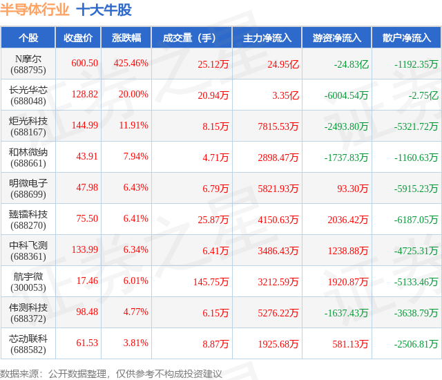 个股表现方面,半导体行业当日领涨股为N摩尔(688795),该股当日报收600.5,上涨425.46%,成交量25.12万,主力资金净流入24.95亿元。长光华芯(688048)以上涨20.0%紧随其后,该股当日成交量20.94万,主力资金净流入3.35亿元。除此之外,炬光科技(688167)、和林微纳(688661)、明微电子(688699)均进入当日牛股之列。具体个股列表见下表: