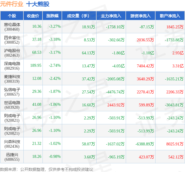 个股表现方面,元件行业当日领跌股为惠伦晶体(300460),该股当日报收10.36,下跌3.27%,成交量18.91万,主力资金净流出1758.1万元。四会富仕(300852)以下跌3.18%紧随其后,该股当日成交量8.53万,主力资金净流出302.66万元。除此之外,沪电股份(002463)、深南电路(002916)、麦捷科技(300319)均进入当日熊股之列。具体个股列表见下表: