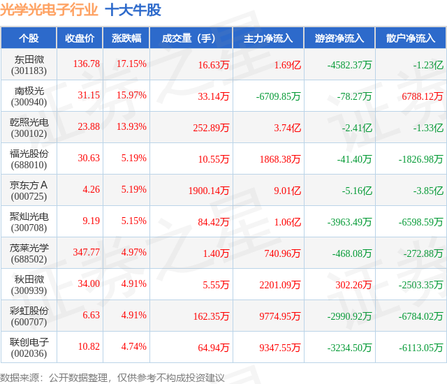 个股表现方面,光学光电子行业当日领涨股为东田微(301183),该股当日报收136.78,上涨17.15%,成交量16.63万,主力资金净流入1.69亿元。南极光(300940)以上涨15.97%紧随其后,该股当日成交量33.14万,主力资金净流出6709.85万元。除此之外,乾照光电(300102)、福光股份(688010)、京东方A(000725)均进入当日牛股之列。具体个股列表见下表: