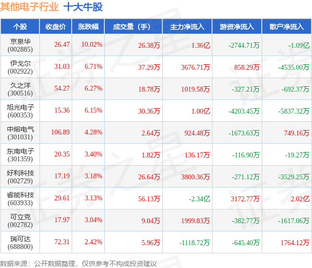 个股表现方面,其他电子行业当日领涨股为京泉华(002885),该股当日报收26.47,上涨10.02%,成交量26.38万,主力资金净流入1.36亿元。伊戈尔(002922)以上涨6.71%紧随其后,该股当日成交量37.29万,主力资金净流入3676.71万元。除此之外,久之洋(300516)、旭光电子(600353)、中熔电气(301031)均进入当日牛股之列。具体个股列表见下表: