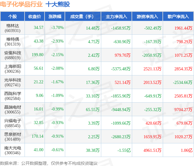 个股表现方面,电子化学品行业当日领跌股为格林达(603931),该股当日报收34.57,下跌3.7%,成交量14.48万,主力资金净流出1458.95万元。唯特偶(301319)以下跌2.93%紧随其后,该股当日成交量4.75万,主力资金净流出630.9万元。除此之外,安集科技(688019)、上海新阳(300236)、光华科技(002741)均进入当日熊股之列。具体个股列表见下表: