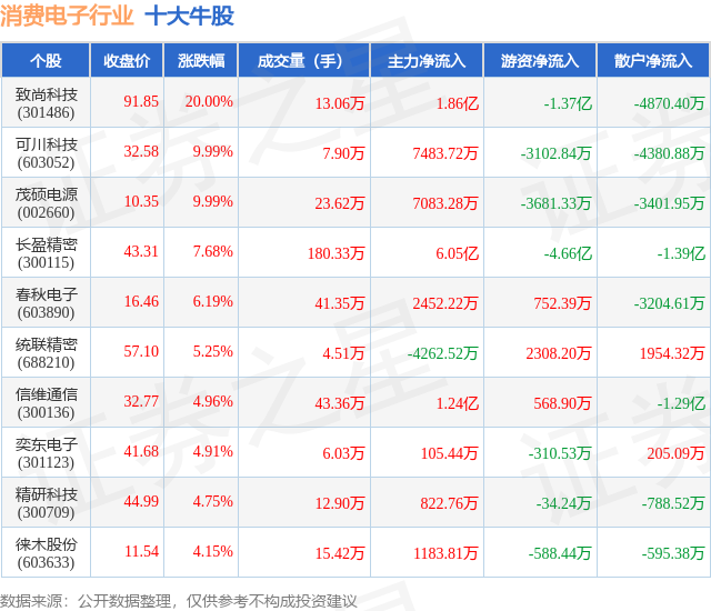 个股表现方面,消费电子行业当日领涨股为致尚科技(301486),该股当日报收91.85,上涨20.0%,成交量13.06万,主力资金净流入1.86亿元。可川科技(603052)以上涨9.99%紧随其后,该股当日成交量7.9万,主力资金净流入7483.72万元。除此之外,茂硕电源(002660)、长盈精密(300115)、春秋电子(603890)均进入当日牛股之列。具体个股列表见下表: