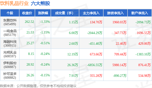 个股表现方面,饮料乳品行业当日领跌股为东鹏饮料(605499),该股当日报收262.52,下跌1.33%,成交量1.15万,主力资金净流入134.7万元。一鸣食品(605179)以下跌1.15%紧随其后,该股当日成交量6.0万,主力资金净流出2044.29万元。除此之外,海融科技(300915)、光明乳业(600597)、伊利股份(600887)均进入当日熊股之列。具体个股列表见下表:
