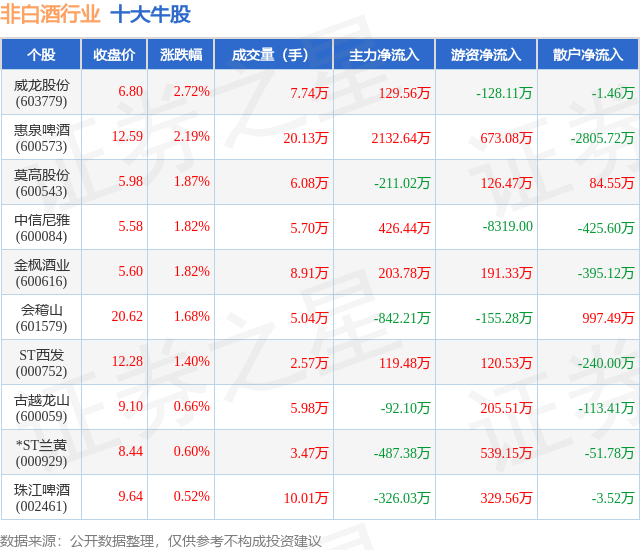 个股表现方面,非白酒行业当日领涨股为威龙股份(603779),该股当日报收6.8,上涨2.72%,成交量7.74万,主力资金净流入129.56万元。惠泉啤酒(600573)以上涨2.19%紧随其后,该股当日成交量20.13万,主力资金净流入2132.64万元。除此之外,莫高股份(600543)、中信尼雅(600084)、金枫酒业(600616)均进入当日牛股之列。具体个股列表见下表: