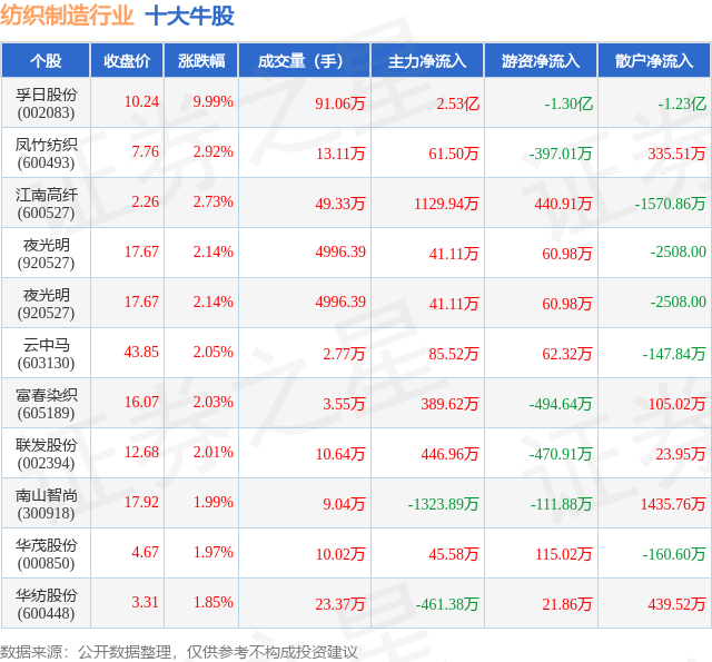 个股表现方面,纺织制造行业当日领涨股为孚日股份(002083),该股当日报收10.24,上涨9.99%,成交量91.06万,主力资金净流入2.53亿元。凤竹纺织(600493)以上涨2.92%紧随其后,该股当日成交量13.11万,主力资金净流入61.5万元。除此之外,江南高纤(600527)、夜光明(920527)、夜光明(920527)均进入当日牛股之列。具体个股列表见下表:
