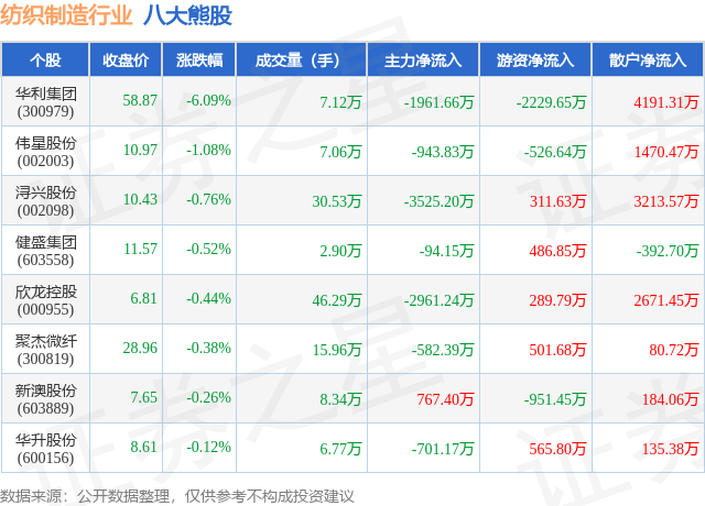 个股表现方面,纺织制造行业当日领跌股为华利集团(300979),该股当日报收58.87,下跌6.09%,成交量7.12万,主力资金净流出1961.66万元。伟星股份(002003)以下跌1.08%紧随其后,该股当日成交量7.06万,主力资金净流出943.83万元。除此之外,浔兴股份(002098)、健盛集团(603558)、欣龙控股(000955)均进入当日熊股之列。具体个股列表见下表: