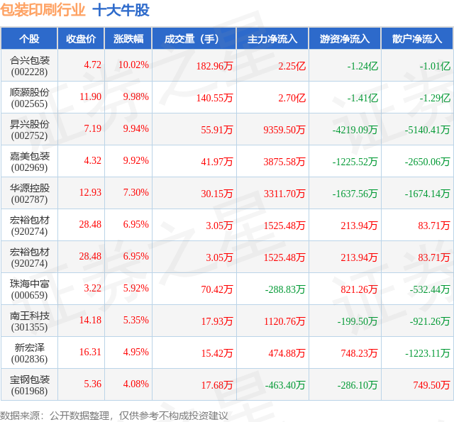 个股表现方面,包装印刷行业当日领涨股为合兴包装(002228),该股当日报收4.72,上涨10.02%,成交量182.96万,主力资金净流入2.25亿元。顺灏股份(002565)以上涨9.98%紧随其后,该股当日成交量140.55万,主力资金净流入2.7亿元。除此之外,昇兴股份(002752)、嘉美包装(002969)、华源控股(002787)均进入当日牛股之列。具体个股列表见下表: