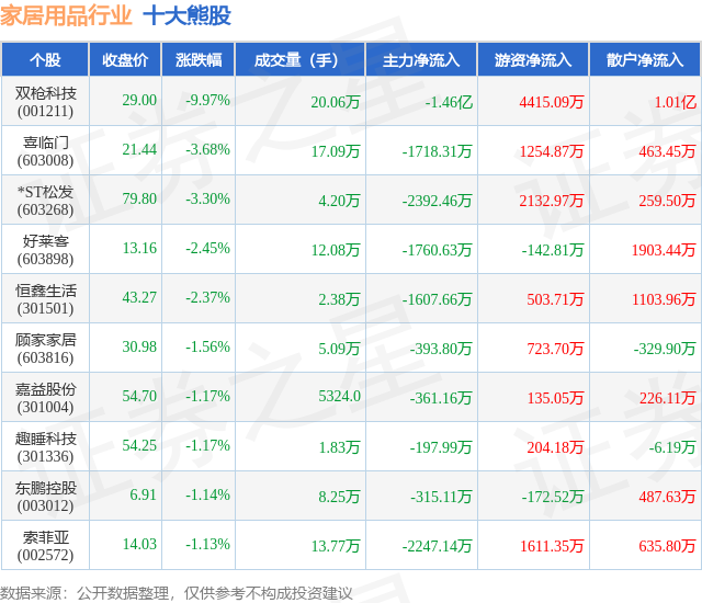个股表现方面,家居用品行业当日领跌股为双枪科技(001211),该股当日报收29.0,下跌9.97%,成交量20.06万,主力资金净流出1.46亿元。喜临门(603008)以下跌3.68%紧随其后,该股当日成交量17.09万,主力资金净流出1718.31万元。除此之外,*ST松发(603268)、好莱客(603898)、恒鑫生活(301501)均进入当日熊股之列。具体个股列表见下表: