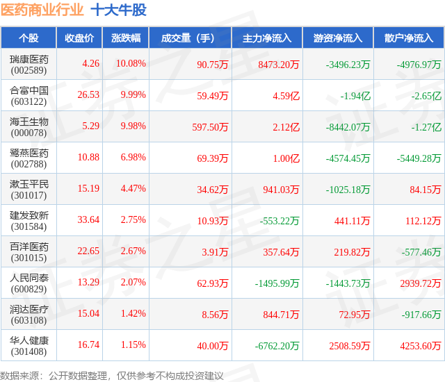 个股表现方面,医药商业行业当日领涨股为瑞康医药(002589),该股当日报收4.26,上涨10.08%,成交量90.75万,主力资金净流入8473.2万元。合富中国(603122)以上涨9.99%紧随其后,该股当日成交量59.49万,主力资金净流入4.59亿元。除此之外,海王生物(000078)、鹭燕医药(002788)、漱玉平民(301017)均进入当日牛股之列。具体个股列表见下表: