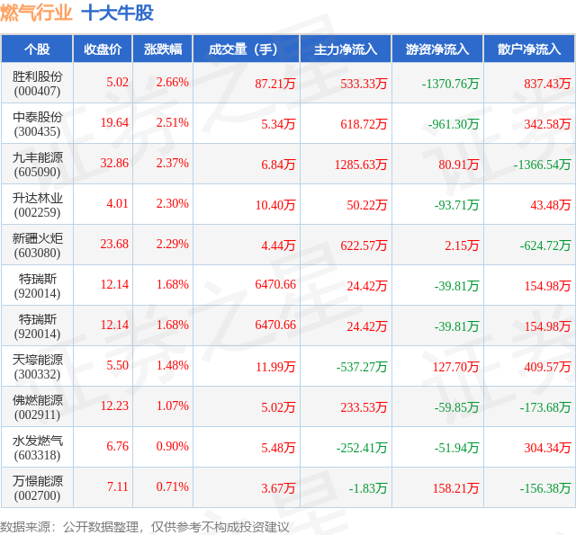 个股表现方面,燃气行业当日领涨股为胜利股份(000407),该股当日报收5.02,上涨2.66%,成交量87.21万,主力资金净流入533.33万元。中泰股份(300435)以上涨2.51%紧随其后,该股当日成交量5.34万,主力资金净流入618.72万元。除此之外,九丰能源(605090)、升达林业(002259)、新疆火炬(603080)均进入当日牛股之列。具体个股列表见下表: