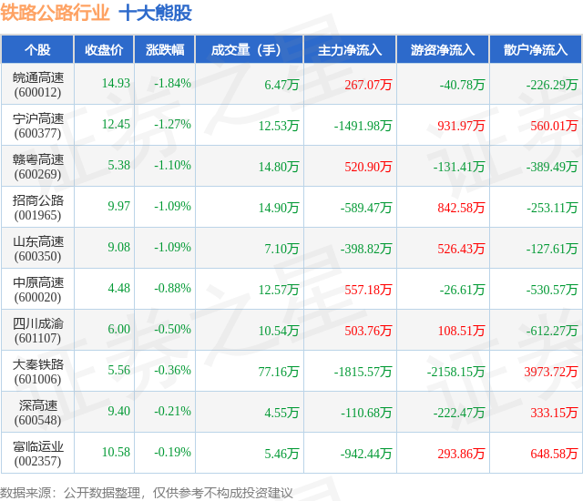 个股表现方面,铁路公路行业当日领跌股为皖通高速(600012),该股当日报收14.93,下跌1.84%,成交量6.47万,主力资金净流入267.07万元。宁沪高速(600377)以下跌1.27%紧随其后,该股当日成交量12.53万,主力资金净流出1491.98万元。除此之外,赣粤高速(600269)、招商公路(001965)、山东高速(600350)均进入当日熊股之列。具体个股列表见下表: