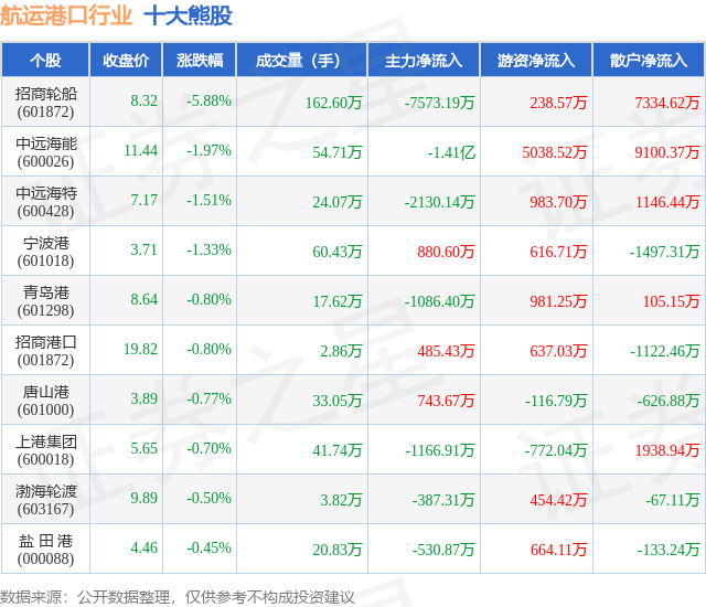 个股表现方面,航运港口行业当日领跌股为招商轮船(601872),该股当日报收8.32,下跌5.88%,成交量162.6万,主力资金净流出7573.19万元。中远海能(600026)以下跌1.97%紧随其后,该股当日成交量54.71万,主力资金净流出1.41亿元。除此之外,中远海特(600428)、宁波港(601018)、青岛港(601298)均进入当日熊股之列。具体个股列表见下表:
