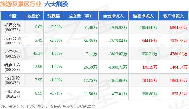 个股表现方面,旅游及景区行业当日领跌股为祥源文旅(600576),该股当日报收6.63,下跌5.56%,成交量51.8万,主力资金净流出4939.92万元。天府文旅(000558)以下跌2.83%紧随其后,该股当日成交量84.35万,主力资金净流出7579.84万元。除此之外,大连圣亚(600593)、峨眉山A(000888)、*ST张股(000430)均进入当日熊股之列。具体个股列表见下表: