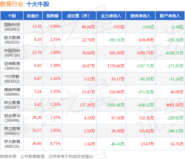 个股表现方面,教育行业当日领涨股为国脉科技(002093),该股当日报收13.1,上涨9.99%,成交量80.66万,主力资金净流入3.97亿元。凯文教育(002659)以上涨2.31%紧随其后,该股当日成交量22.78万,主力资金净流出392.11万元。除此之外,中国高科(600730)、豆神教育(300010)、*ST传智(003032)均进入当日牛股之列。具体个股列表见下表: