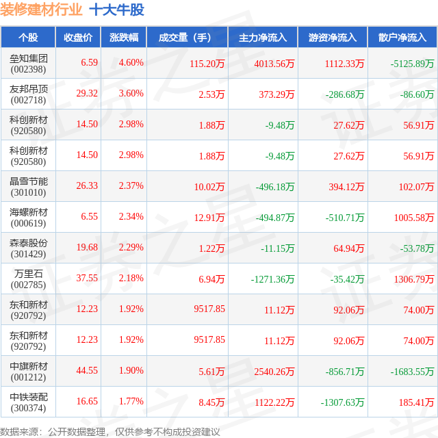 个股表现方面,装修建材行业当日领涨股为垒知集团(002398),该股当日报收6.59,上涨4.6%,成交量115.2万,主力资金净流入4013.56万元。友邦吊顶(002718)以上涨3.6%紧随其后,该股当日成交量2.53万,主力资金净流入373.29万元。除此之外,科创新材(920580)、科创新材(920580)、晶雪节能(301010)均进入当日牛股之列。具体个股列表见下表: