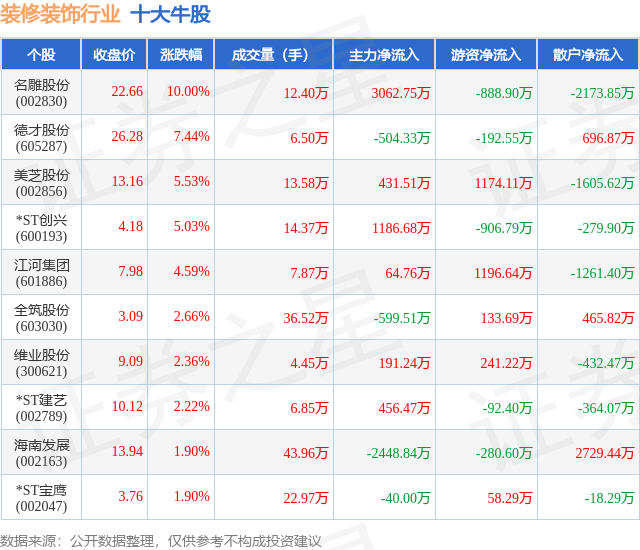 个股表现方面,装修装饰行业当日领涨股为名雕股份(002830),该股当日报收22.66,上涨10.0%,成交量12.4万,主力资金净流入3062.75万元。德才股份(605287)以上涨7.44%紧随其后,该股当日成交量6.5万,主力资金净流出504.33万元。除此之外,美芝股份(002856)、*ST创兴(600193)、江河集团(601886)均进入当日牛股之列。具体个股列表见下表: