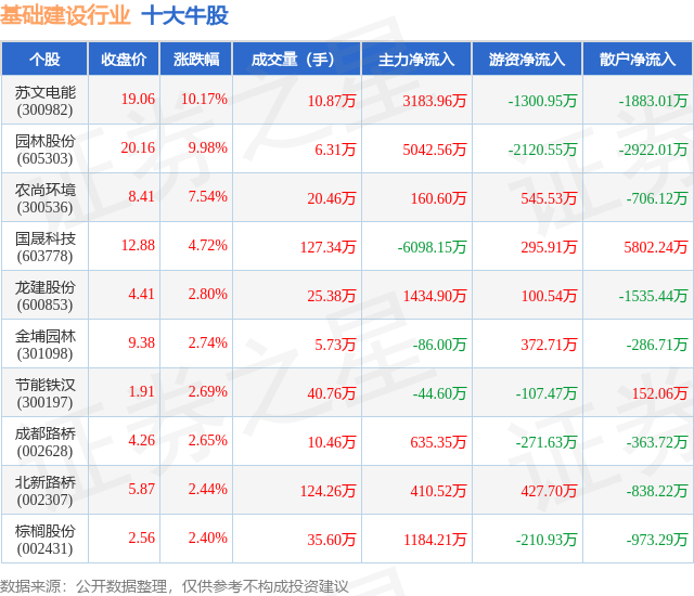 个股表现方面,基础建设行业当日领涨股为苏文电能(300982),该股当日报收19.06,上涨10.17%,成交量10.87万,主力资金净流入3183.96万元。园林股份(605303)以上涨9.98%紧随其后,该股当日成交量6.31万,主力资金净流入5042.56万元。除此之外,农尚环境(300536)、国晟科技(603778)、龙建股份(600853)均进入当日牛股之列。具体个股列表见下表: