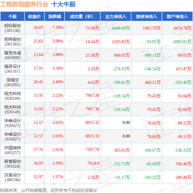 个股表现方面,工程咨询服务行业当日领涨股为招标股份(301136),该股当日报收26.87,上涨7.39%,成交量73.99万,主力资金净流出6440.49万元。矩阵股份(301365)以上涨3.98%紧随其后,该股当日成交量14.34万,主力资金净流入2185.83万元。除此之外,建发合诚(603909)、建研设计(301167)、深城交(301091)均进入当日牛股之列。具体个股列表见下表: