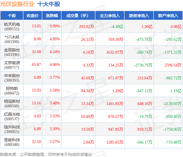 个股表现方面,光伏设备行业当日领涨股为航天机电(600151),该股当日报收13.65,上涨9.99%,成交量293.92万,主力资金净流出4.3亿元。*ST沐邦(603398)以上涨4.95%紧随其后,该股当日成交量26.53万,主力资金净流入769.39万元。除此之外,金辰股份(603396)、艾罗能源(688717)、中来股份(300393)均进入当日牛股之列。具体个股列表见下表:
