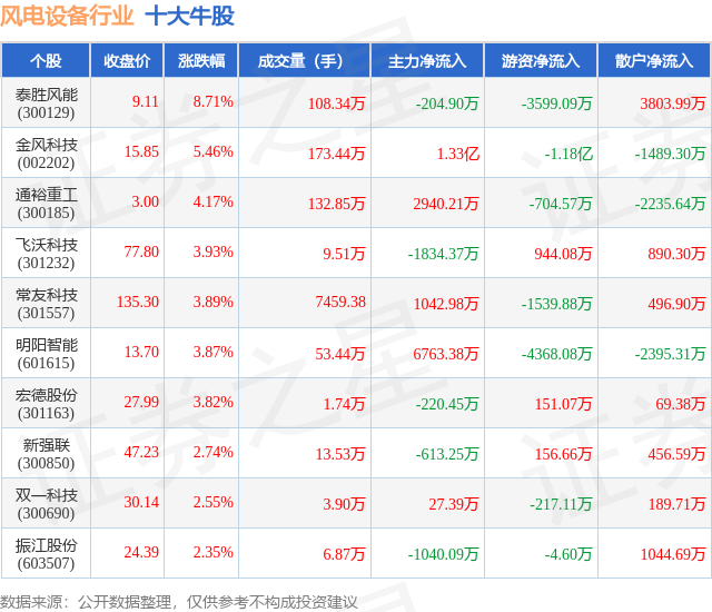 个股表现方面,风电设备行业当日领涨股为泰胜风能(300129),该股当日报收9.11,上涨8.71%,成交量108.34万,主力资金净流出204.9万元。金风科技(002202)以上涨5.46%紧随其后,该股当日成交量173.44万,主力资金净流入1.33亿元。除此之外,通裕重工(300185)、飞沃科技(301232)、常友科技(301557)均进入当日牛股之列。具体个股列表见下表: