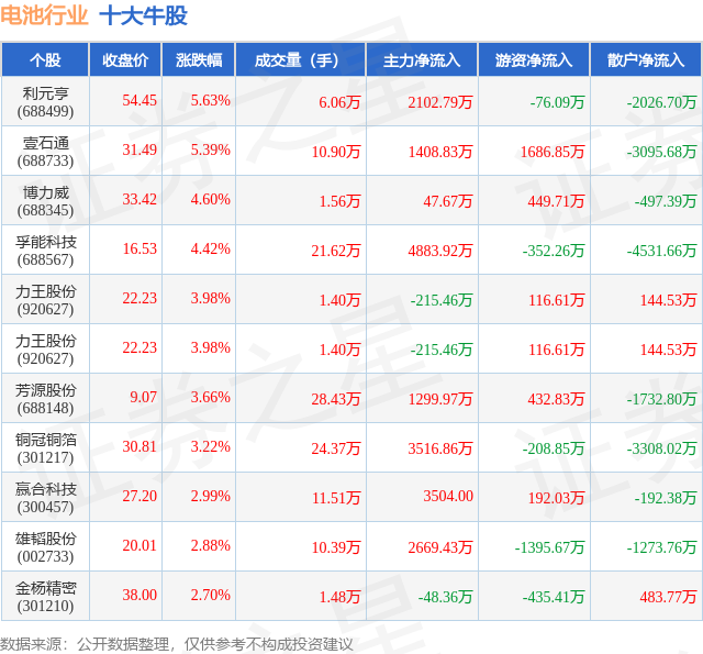 个股表现方面,电池行业当日领涨股为利元亨(688499),该股当日报收54.45,上涨5.63%,成交量6.06万,主力资金净流入2102.79万元。壹石通(688733)以上涨5.39%紧随其后,该股当日成交量10.9万,主力资金净流入1408.83万元。除此之外,博力威(688345)、孚能科技(688567)、力王股份(920627)均进入当日牛股之列。具体个股列表见下表: