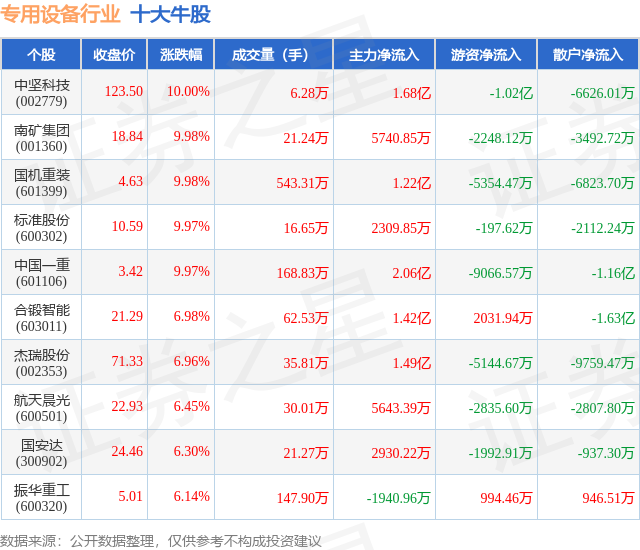 个股表现方面,专用设备行业当日领涨股为中坚科技(002779),该股当日报收123.5,上涨10.0%,成交量6.28万,主力资金净流入1.68亿元。南矿集团(001360)以上涨9.98%紧随其后,该股当日成交量21.24万,主力资金净流入5740.85万元。除此之外,国机重装(601399)、标准股份(600302)、中国一重(601106)均进入当日牛股之列。具体个股列表见下表: