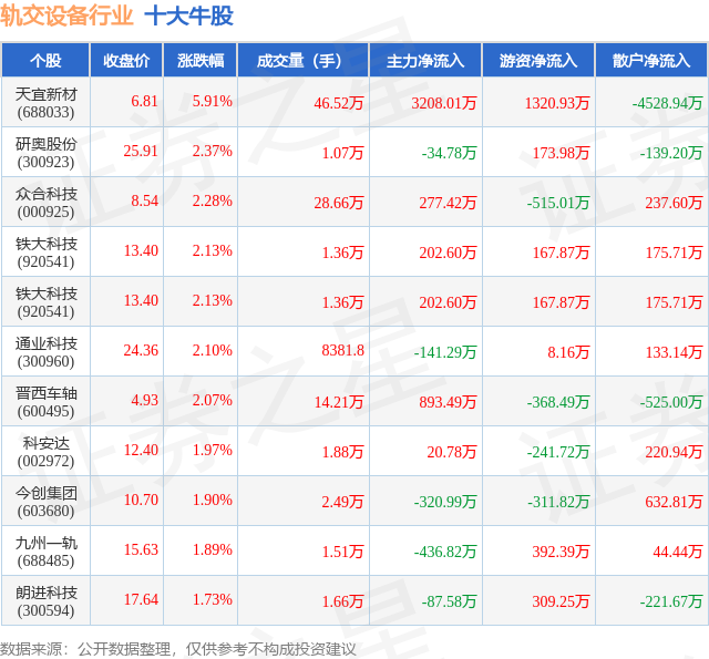 个股表现方面,轨交设备行业当日领涨股为天宜新材(688033),该股当日报收6.81,上涨5.91%,成交量46.52万,主力资金净流入3208.01万元。研奥股份(300923)以上涨2.37%紧随其后,该股当日成交量1.07万,主力资金净流出34.78万元。除此之外,众合科技(000925)、铁大科技(920541)、铁大科技(920541)均进入当日牛股之列。具体个股列表见下表:
