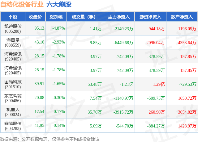 个股表现方面,自动化设备行业当日领跌股为凯迪股份(605288),该股当日报收95.13,下跌4.87%,成交量1.41万,主力资金净流出2140.23万元。海目星(688559)以下跌2.93%紧随其后,该股当日成交量9.85万,主力资金净流出6449.68万元。除此之外,海希通讯(920405)、海希通讯(920405)、固高科技(301510)均进入当日熊股之列。具体个股列表见下表: