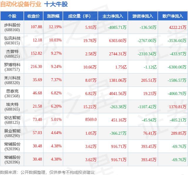 个股表现方面,自动化设备行业当日领涨股为步科股份(688160),该股当日报收107.88,上涨12.19%,成交量5.93万,主力资金净流出4085.71万元。弘讯科技(603015)以上涨10.03%紧随其后,该股当日成交量19.78万,主力资金净流入6303.6万元。除此之外,杰普特(688025)、罗博特科(300757)、禾川科技(688320)均进入当日牛股之列。具体个股列表见下表: