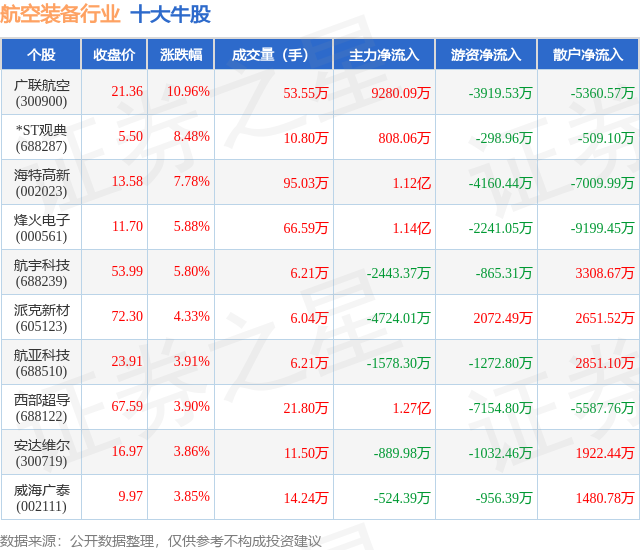 个股表现方面,航空装备行业当日领涨股为广联航空(300900),该股当日报收21.36,上涨10.96%,成交量53.55万,主力资金净流入9280.09万元。*ST观典(688287)以上涨8.48%紧随其后,该股当日成交量10.8万,主力资金净流入808.06万元。除此之外,海特高新(002023)、烽火电子(000561)、航宇科技(688239)均进入当日牛股之列。具体个股列表见下表: