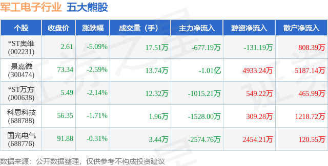 个股表现方面,军工电子行业当日领跌股为*ST奥维(002231),该股当日报收2.61,下跌5.09%,成交量17.51万,主力资金净流出677.19万元。景嘉微(300474)以下跌2.59%紧随其后,该股当日成交量13.74万,主力资金净流出1.01亿元。除此之外,*ST万方(000638)、科思科技(688788)、国光电气(688776)均进入当日熊股之列。具体个股列表见下表: