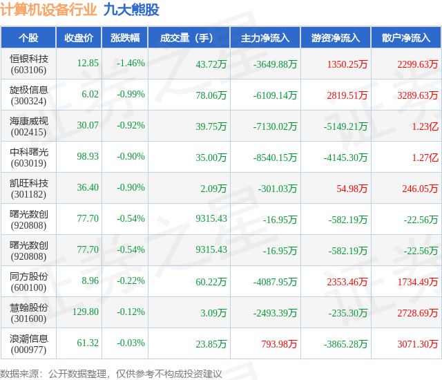 个股表现方面,计算机设备行业当日领跌股为恒银科技(603106),该股当日报收12.85,下跌1.46%,成交量43.72万,主力资金净流出3649.88万元。旋极信息(300324)以下跌0.99%紧随其后,该股当日成交量78.06万,主力资金净流出6109.14万元。除此之外,海康威视(002415)、中科曙光(603019)、凯旺科技(301182)均进入当日熊股之列。具体个股列表见下表: