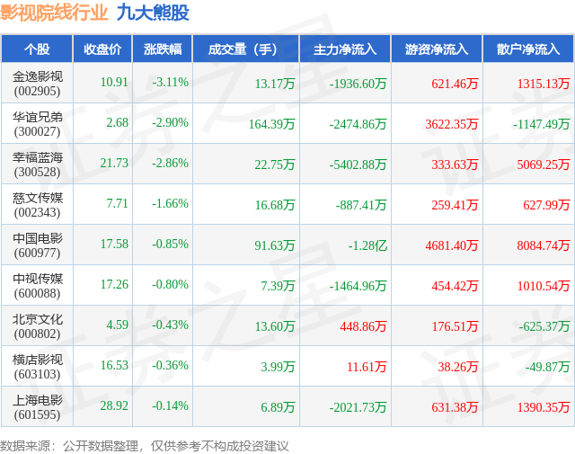 个股表现方面,影视院线行业当日领跌股为金逸影视(002905),该股当日报收10.91,下跌3.11%,成交量13.17万,主力资金净流出1936.6万元。华谊兄弟(300027)以下跌2.9%紧随其后,该股当日成交量164.39万,主力资金净流出2474.86万元。除此之外,幸福蓝海(300528)、慈文传媒(002343)、中国电影(600977)均进入当日熊股之列。具体个股列表见下表: