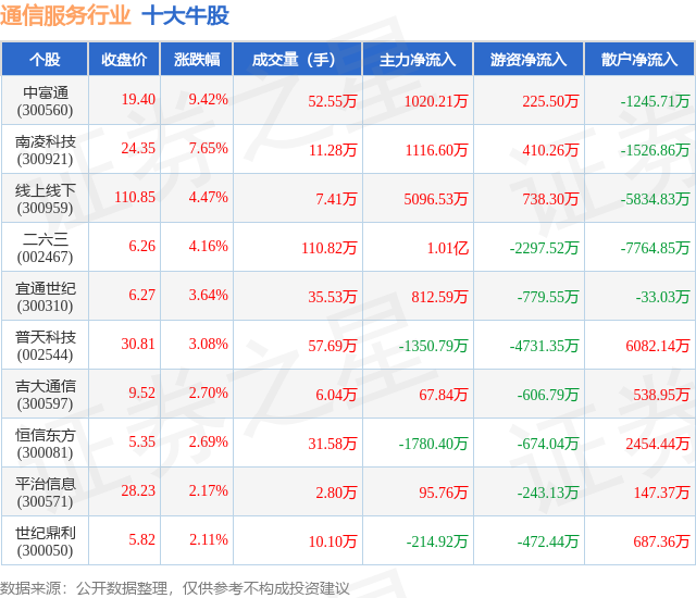 个股表现方面,通信服务行业当日领涨股为中富通(300560),该股当日报收19.4,上涨9.42%,成交量52.55万,主力资金净流入1020.21万元。南凌科技(300921)以上涨7.65%紧随其后,该股当日成交量11.28万,主力资金净流入1116.6万元。除此之外,线上线下(300959)、二六三(002467)、宜通世纪(300310)均进入当日牛股之列。具体个股列表见下表: