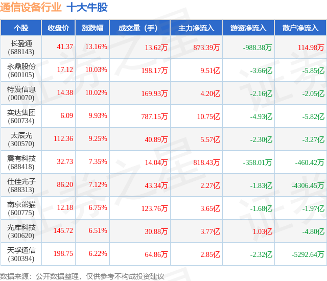 个股表现方面,通信设备行业当日领涨股为长盈通(688143),该股当日报收41.37,上涨13.16%,成交量13.62万,主力资金净流入873.39万元。永鼎股份(600105)以上涨10.03%紧随其后,该股当日成交量198.17万,主力资金净流入9.51亿元。除此之外,特发信息(000070)、实达集团(600734)、太辰光(300570)均进入当日牛股之列。具体个股列表见下表: