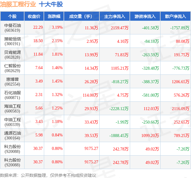 个股表现方面,油服工程行业当日领涨股为中曼石油(603619),该股当日报收22.29,上涨3.19%,成交量11.36万,主力资金净流入2159.47万元。潜能恒信(300191)以上涨2.15%紧随其后,该股当日成交量2.95万,主力资金净流入4.1万元。除此之外,贝肯能源(002828)、仁智股份(002629)、惠博普(002554)均进入当日牛股之列。具体个股列表见下表: