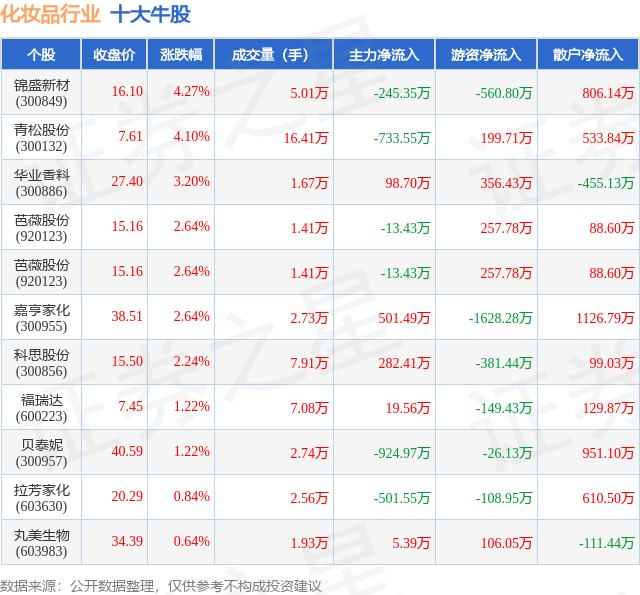 个股表现方面,化妆品行业当日领涨股为锦盛新材(300849),该股当日报收16.1,上涨4.27%,成交量5.01万,主力资金净流出245.35万元。青松股份(300132)以上涨4.1%紧随其后,该股当日成交量16.41万,主力资金净流出733.55万元。除此之外,华业香料(300886)、芭薇股份(920123)、芭薇股份(920123)均进入当日牛股之列。具体个股列表见下表: