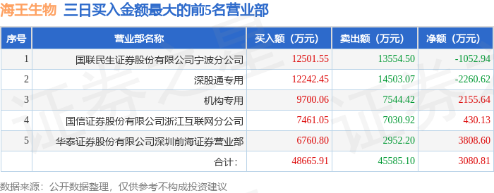 证券之星消息,沪深交易所2025年12月5日公布的交易公开信息显示,海王生物(000078)因日涨幅偏离值达到7%的前5只证券,连续三个交易日内,涨幅偏离值累计达到20%的证券,严重异常期间日收盘价格涨幅偏离值累计达到100%的证券登上龙虎榜。此次是近5个交易日内第2次上榜。