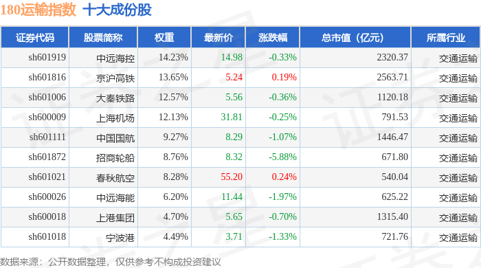 证券之星消息,12月5日,180运输(000027)指数报收于761.14点,跌0.96%,成交52.64亿元,换手率0.41%。当日该指数成份股中,上涨的有2家,春秋航空以0.24%的涨幅领涨,下跌的有11家,招商轮船以5.88%的跌幅领跌。